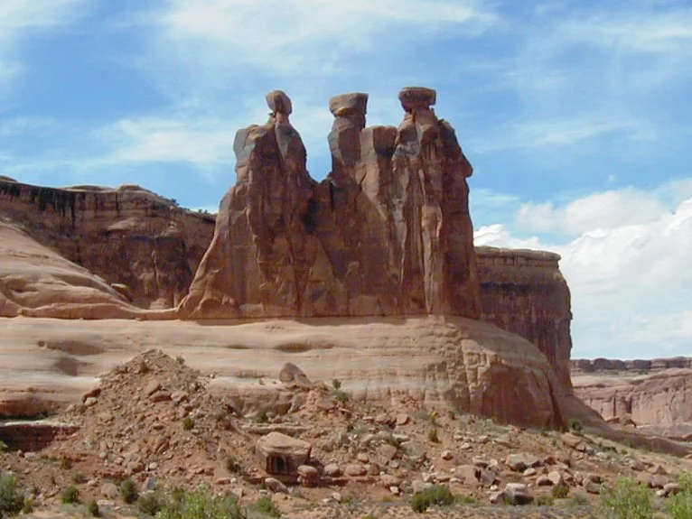 This poem continues my series of poems inspired by various famous sandstone arches and towers found in Arches National Monument, Utah. These poems are meant to use the famous natural structures as foils to reflect on the nature of human becoming. The three-towered structure pictured above is sometimes referred to as The Three Gossips and is sometimes referred to as The Three Kings. Deciding which name to use for the poem would send the poem in very different directions. And this in itself struck me: how powerful the name we give ourselves to shape who we become. Suddenly this idea took over the poem itself and shaped its becoming. Everything depended on the name!